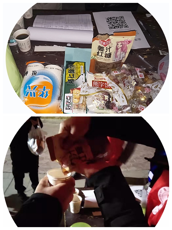 “这会儿没什么人,快喝点水吃点东西,休息一下吧!”不一会儿,熟悉的声音再次传来,正是刚才那女孩,一边说着,一边从包里掏出零食堆在桌上。她的丈夫提着一壶热水,拎着一袋红糖紧跟她身后,笑盈盈地走向志愿者们。