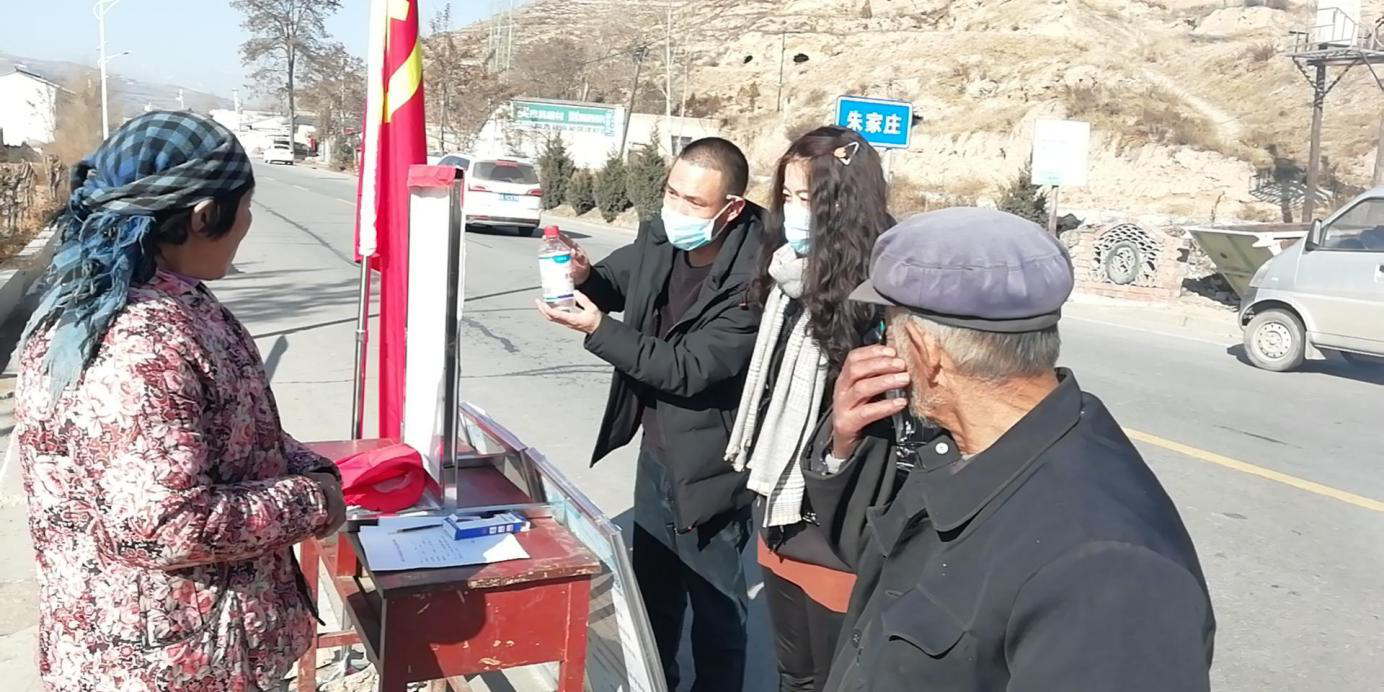 三岔镇纪委干部在朱家庄村对村民如何正确使用消毒液进行指导。