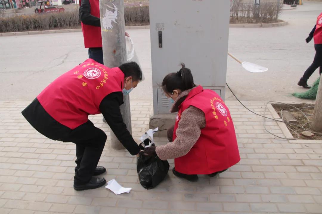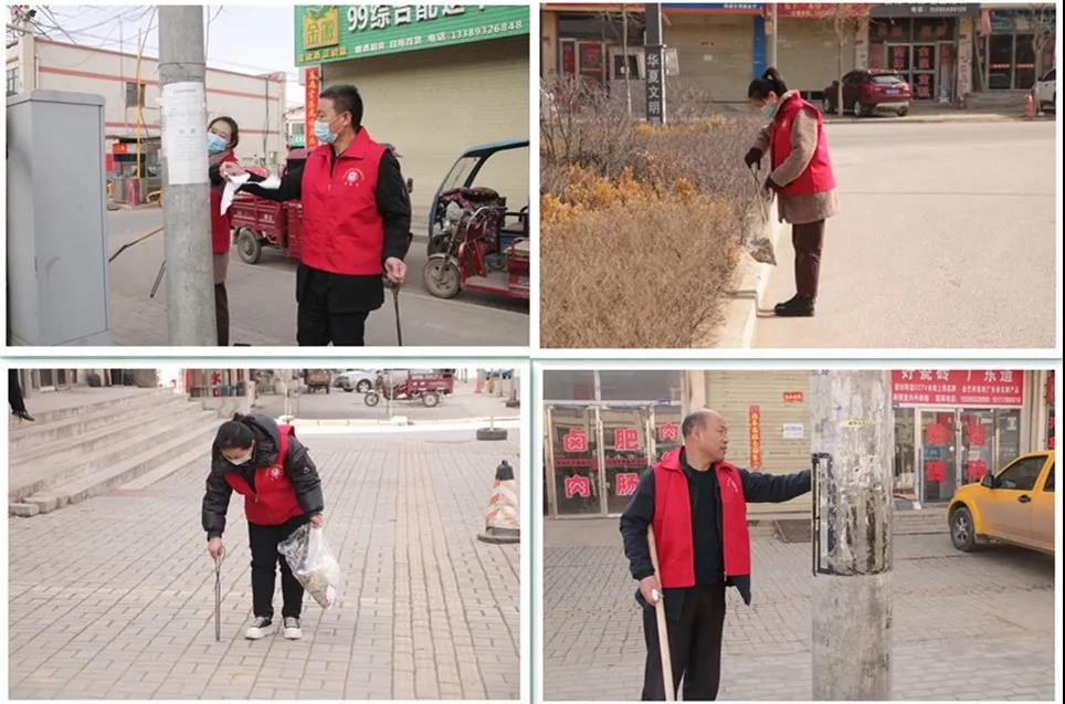 在县药材市场区域路段,志愿服务者对人行道、绿化带、小广告等进行清理。