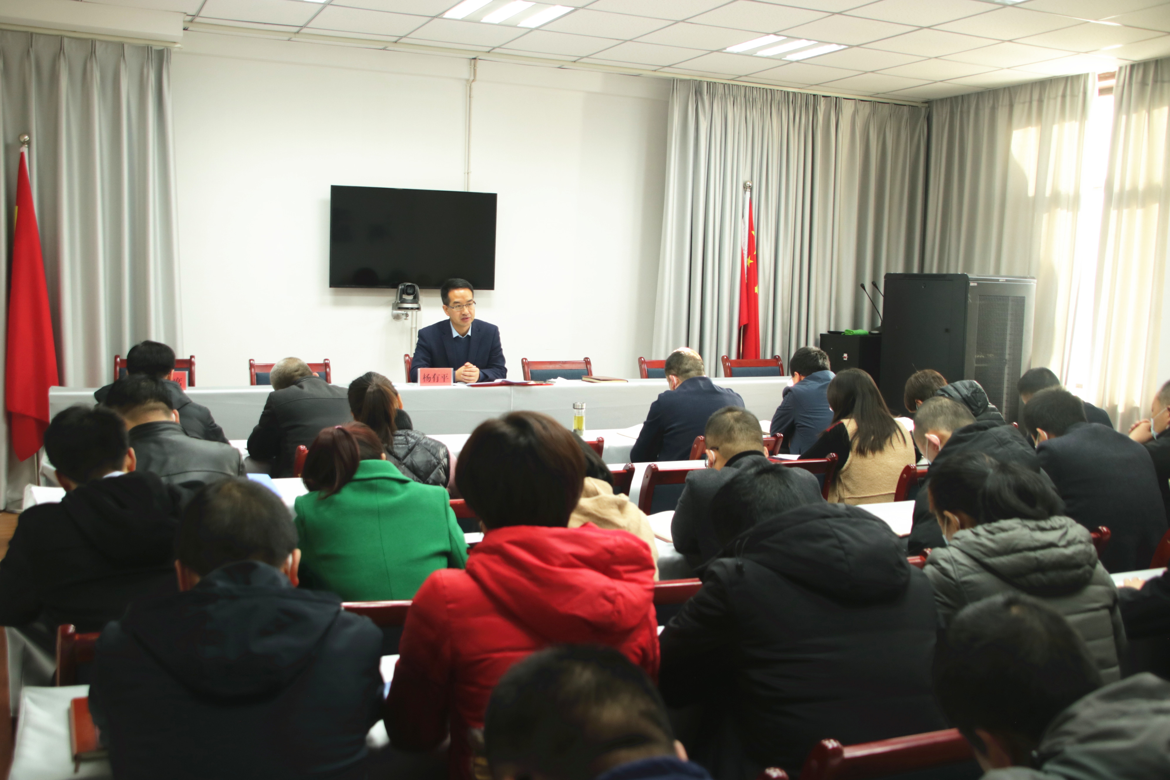 县纪委副书记、县监委副主任杨有平主持会议并传达学习中国共产党第十九届中央委员会第六次全体会议公报。