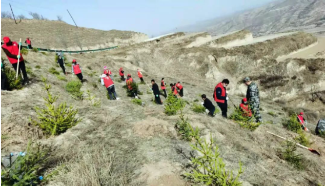 植树现场,参与植树的党员干部按照“选好一棵苗、挖好一个坑、浇好一坑水、覆好一张膜”要求,发扬互助、团结、不言苦、不畏难的精神,挥锄动锹、运苗扶苗、围堰培土、浇水覆膜,每一个环节都一丝不苟、有条不紊。