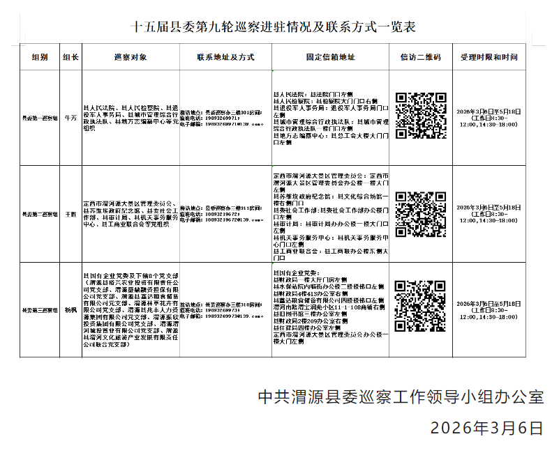 按照县委统一部署,2026年3月上旬至5月中旬,十五届县委第九轮巡察安排3个巡察组对县人民法院、县人民检察院、定西市渭河源大景区管理委员会、县苏维埃政府纪念馆、县委社会工作部、县审计局、县退役军人事务局、县城市管理综合行政执法队、县机关事务服务中心、县地方志编纂中心、县工商业联合会等11个部门(单位)党组织和县国有企业党委及下辖8个党组织开展常规巡察。